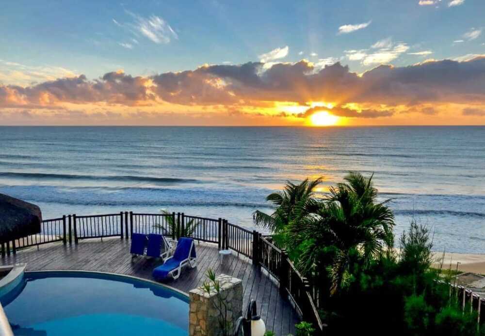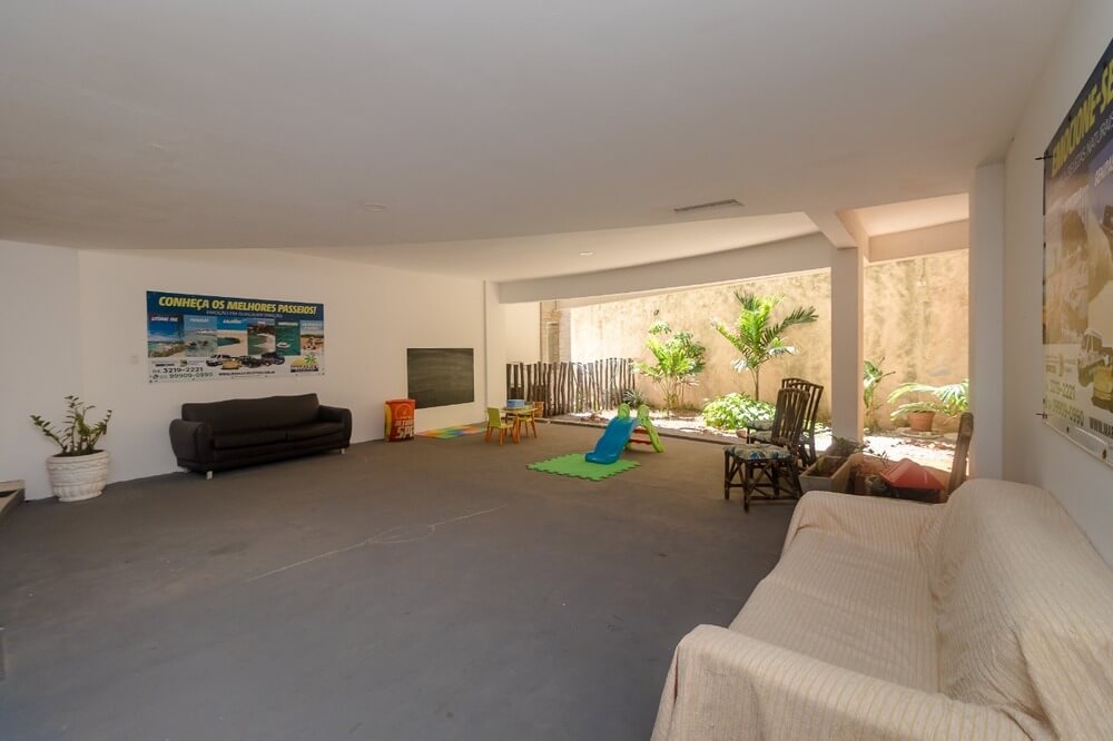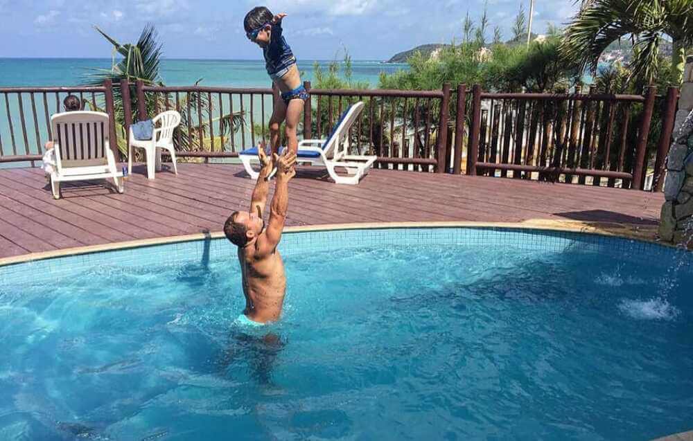 Deck com piscina ao ar livre com linda vista para o mar; brinquedoteca para a diversão das crianças.